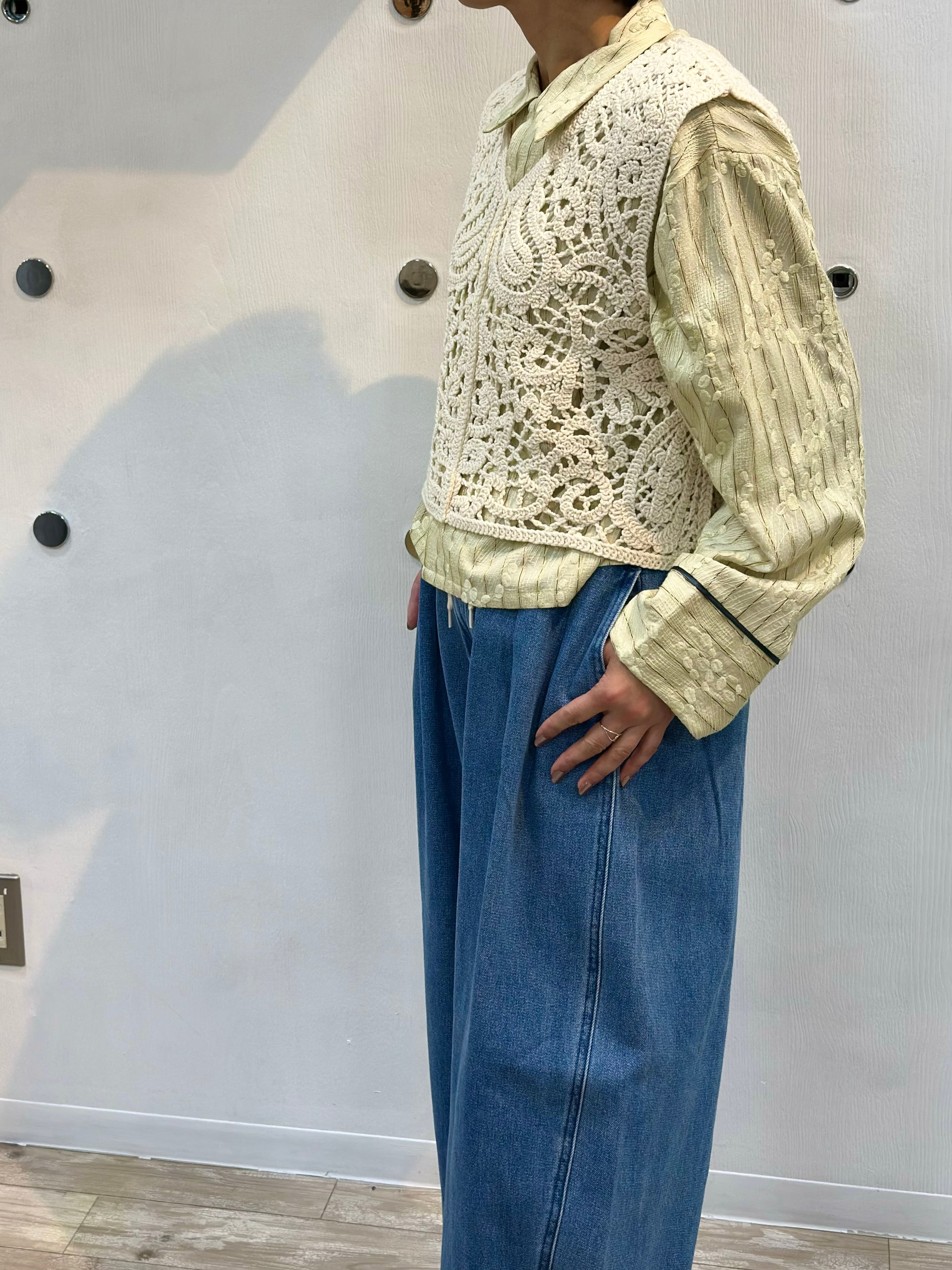 前後着用が可能なクロシェ編みニットベスト。
