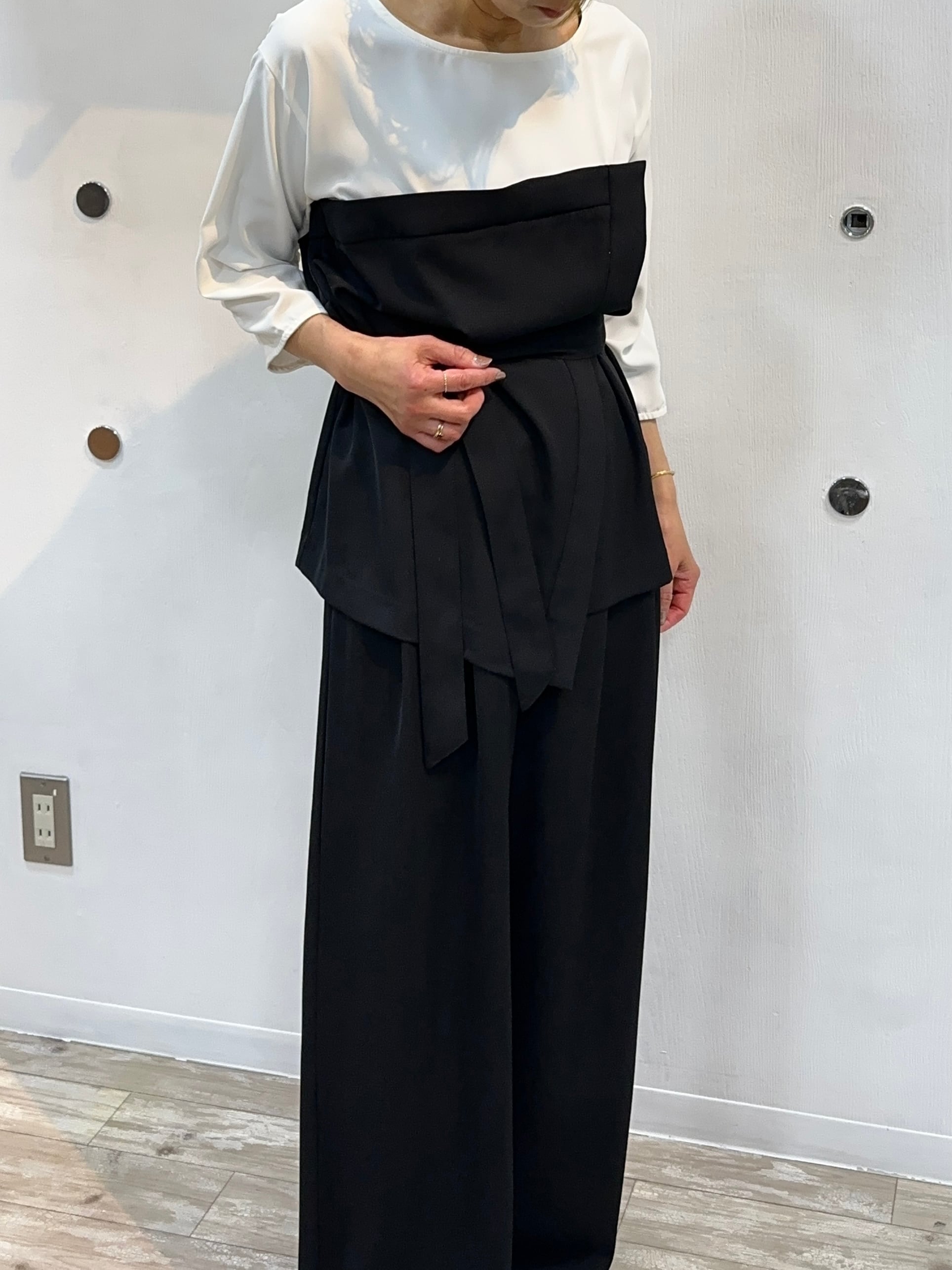 同素材のカラーレスジャケット、キャミ切替ブラウスとセットアップとして着用可。